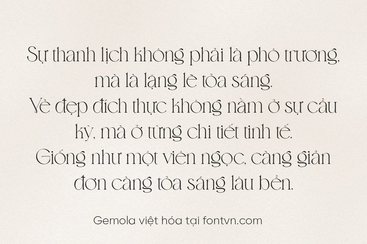 Gemola Việt hóa là một kiểu chữ serif hiện đại mang phong cách thời thượng với những đường nét thanh mảnh kết hợp chi tiết uốn lượn đầy nghệ thuật. Font sở hữu cảm giác sang trọng, quý phái, phù hợp cho các dự án thiết kế cao cấp như thương hiệu thời trang, mỹ phẩm, trang sức, bìa sách, poster hay bao bì sản phẩm.