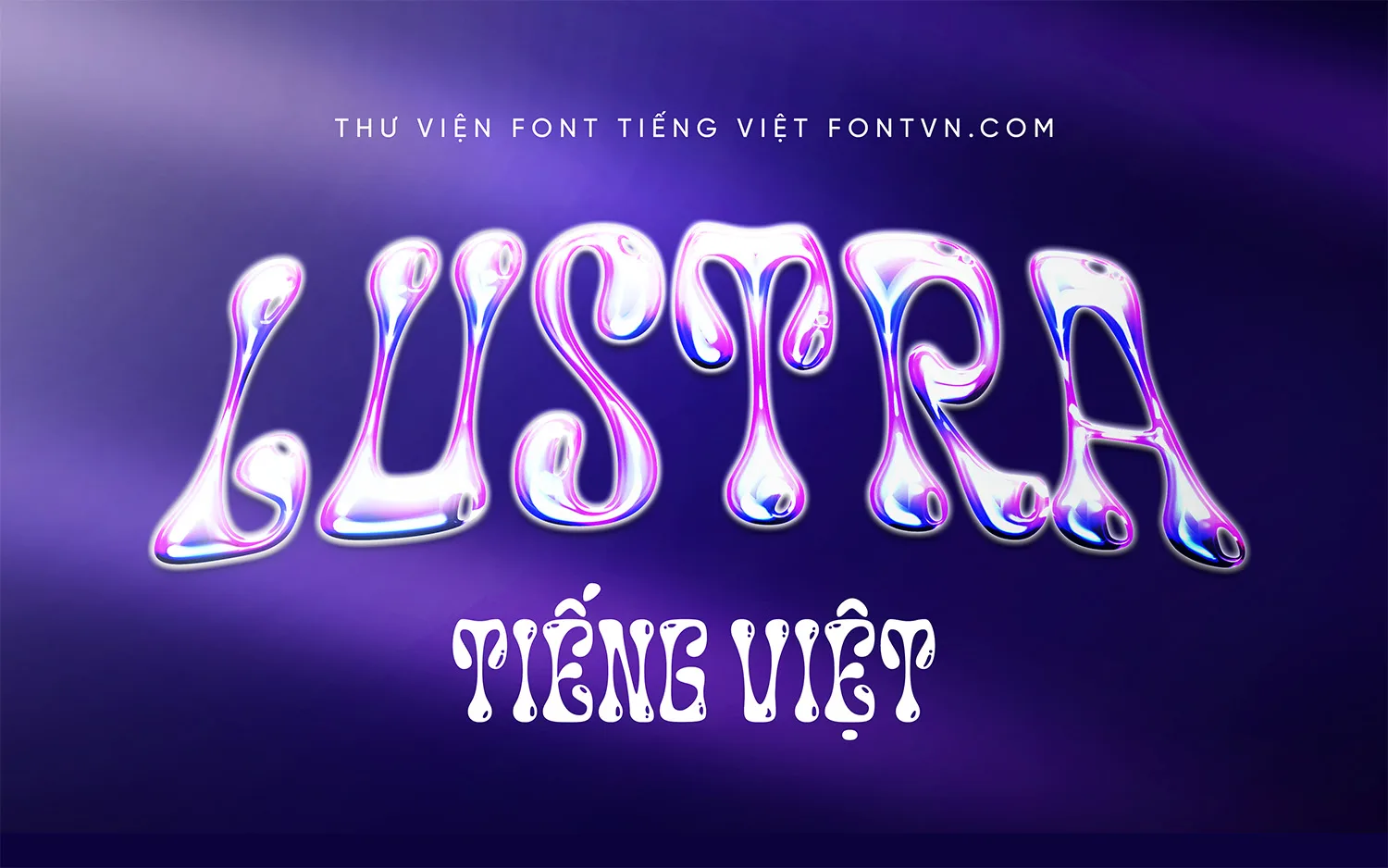 DVN Lustra Việt hóa – Font chữ mang phong cách liquid glass hiện đại, phản chiếu ánh sáng như thủy tinh tan chảy. Nét chữ mềm mại, bóng mịn, kết hợp hiệu ứng chuyển sắc tím – xanh – hồng đặc trưng của xu hướng Y2K mang đến cảm giác tương lai pha lẫn hoài niệm.